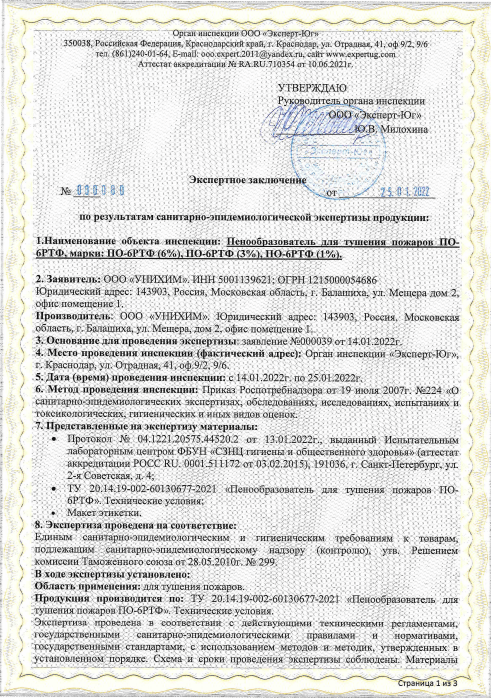Пенообразователь для тушения пожаров ПО-6РТФ, марки: ПО-6РТФ (6%), ПО-6РТФ (3%), ПО-6РТФ (1%) по ТУ 20.14.19-002-60130677-2021 «Пенообразователь для тушения пожаров ПО-6РТФ. Технические условия» (синтетический фторсодержащий плёнкообразующий целевого назначения, типа AFFF, применяемый в виде пены низкой, средней и высокой кратности с использованием питьевой, жесткой и морской воды)