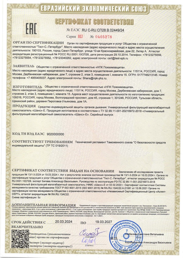 Пункт 4 статьи 52. Федерального закона от 22.07.2008 № 123-ФЗ «Технический регламент о требованиях пожарной безопасности» устанавливает, что защита людей и имущества от воздействия опасных факторов пожара и ограничение последствий их воздействия обеспечиваются применением средств индивидуальной защиты людей от воздействия опасных факторов пожара. Наши самоспасатели и средства локальной защиты марки «Шанс» относятся к средствам индивидуальной защиты людей от воздействия опасных факторов пожара.